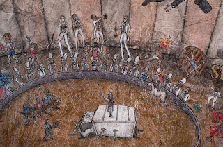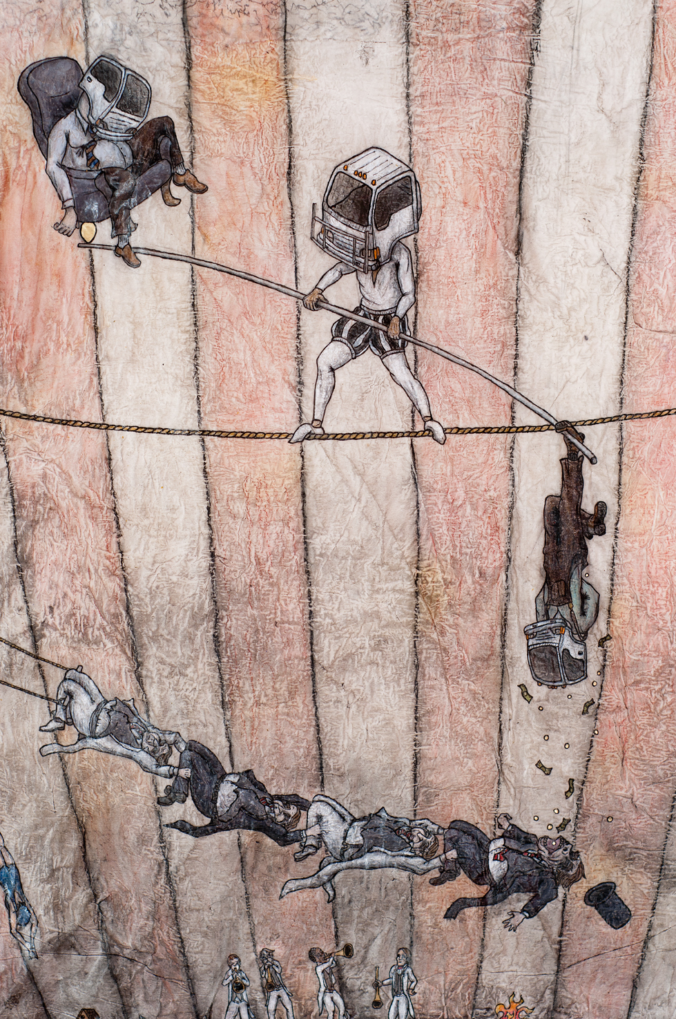 Jade Townsend’s new body of work, Leviathan, assembles an absurd and fragmented narrative. As told by an amalgam of outcasts – the rebel, the orphan, the mystic – a coalescing set of stories manifests as a sculptural passageway through which to pass and return. Similar to his past mixed media sculptures and installations that critique and intensify tragic sociopolitical realities, Leviathan layers multiple myths and allegories, along with their archetypal characters, to pursue the conflicting destinations of contentment and rebellion. Whether or not such a goal is achievable is of little concern. Rather, as Townsend has continued exorcise in his work, it is the failure to see what is given up as we seek what we wish to gain. “Now, from this peculiar sideway position of the whale's eyes, it is plain that he can never see an object which is exactly ahead, no more than he can one exactly astern.” Moby Dick In Townsend’s account, the inevitable blind spot of futile pursuits is reified in the gallery as an abandoned commercial box truck. Entered through the rear of its empty corpus and delivered to the decapitated head, the everyday Leviathan is simultaneously the whale and the ship that sought its demise. As it lies in state, the delivery truck serves as a prop of triumph and defeat. Surrounded by drawn imagery of misguided rebels, reckless strivers and their delusional conquests and superstitions, the gutted beast foretells their fate. Unable to see what is in front of them, the vision-impaired Ahab, Sisyphus, and the tarot reader mingle together, each interrupting the others’ tales of implacable affliction and curse.